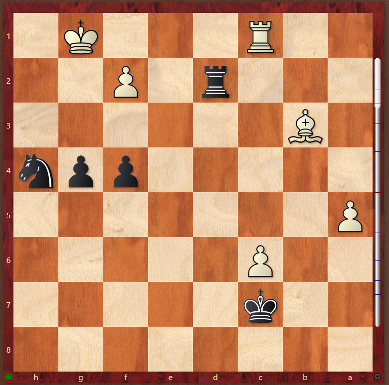 Es begann das große Zittern, und die Zeitnotphase sorgte für zusätzliche Dramatik. Daniel konnte den materiellen Nachteil leider nicht mehr ausgleichen, sodass Lübeck mit 1:1 in Führung ging (ja, wegen Pokal). In dieser kritischen Phase zeigte sich jedoch die Entschlossenheit unseres Teams. Magnus fand einen hoffnungsvollen Trick in der Stellung, und Sebastian konnte mit zwei Bauern, Springer und Turm am Königsflügel trotz Minusbauern überraschend noch den ganzen Punkt einfahren, Stellung siehe unten. Magnus' Trick in der Zeitnotphase ging auf, und mit neuen 30 Minuten Bedenkzeit ließ er sich den Sieg nicht mehr nehmen. Am Ende stand ein glücklicher, aber verdienter 3:1-Sieg für uns.