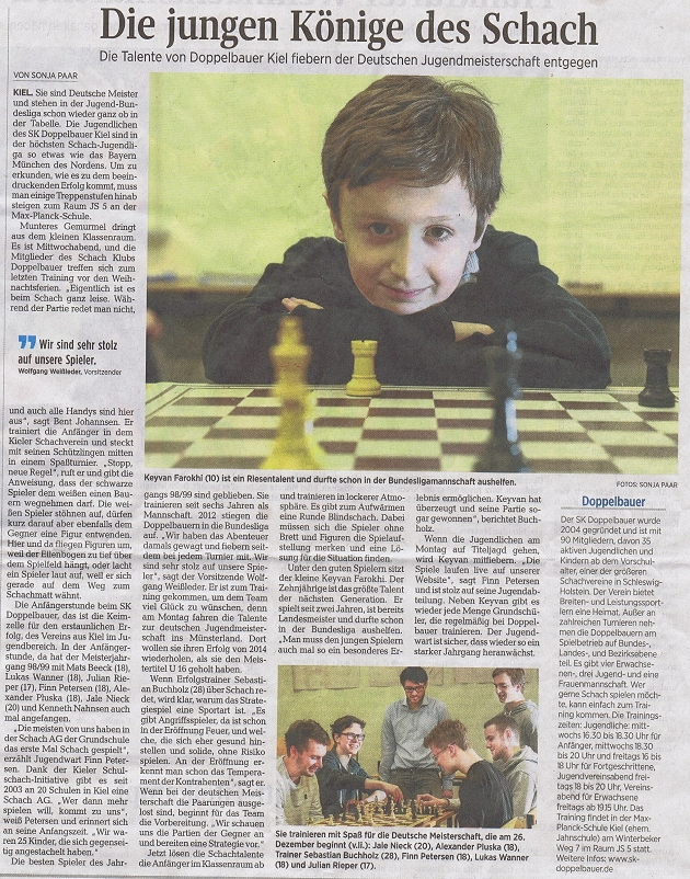 Am 24.12. lies sich auf der ersten Seite des Sportteils der Kieler Nachrichten ein großer Artikel über die Jugendarbeit und die heute beginnende DVM U20 unseres Vereins. Dieser Artikel ist sehr lesenswert und lässt sich im folgenden finden. Eine Anmerkung zu unseren Trainingszeiten: Es findet in den Ferien kein Schach statt. Das erste Training nach den Ferien findet am 11.01.17 statt.