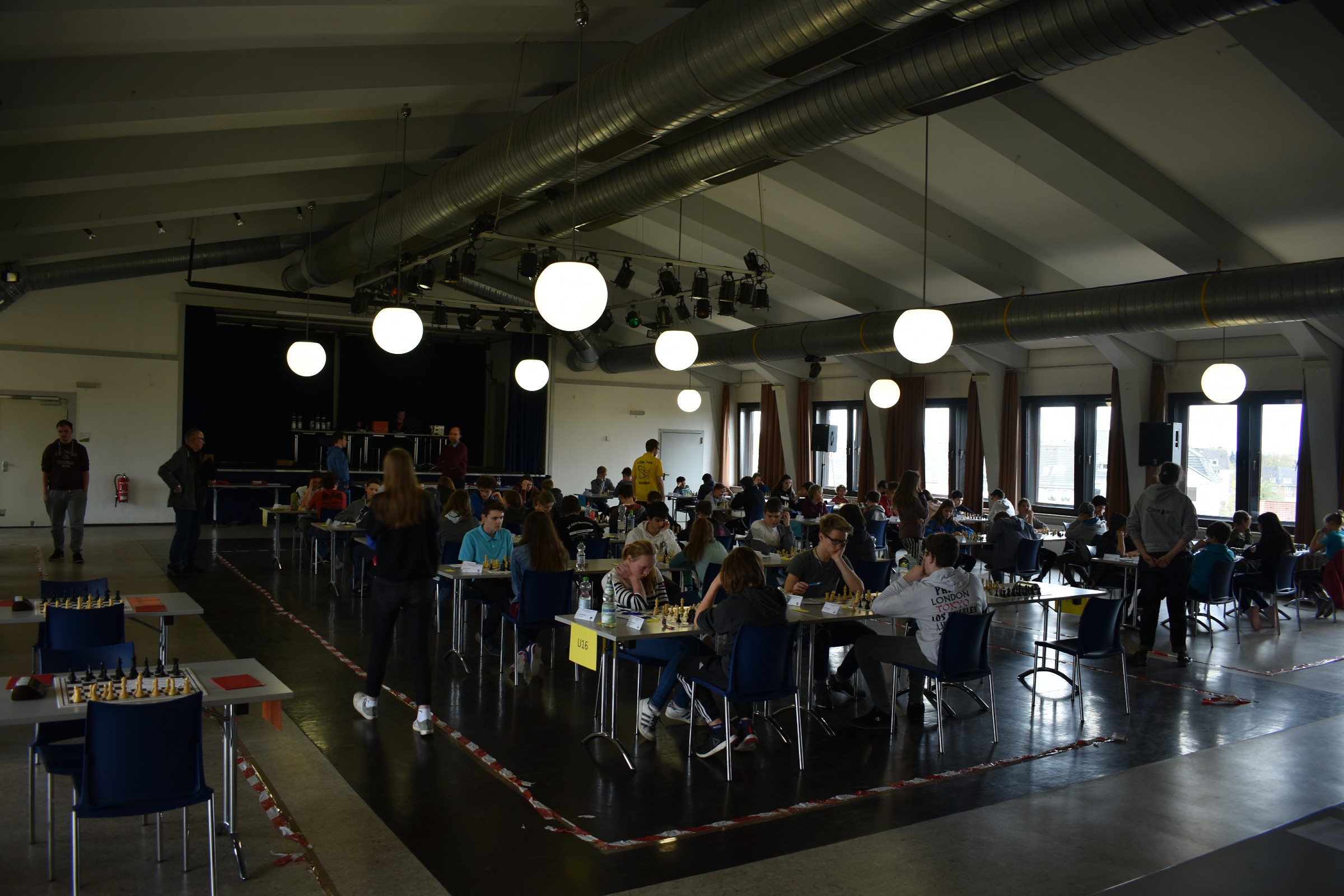 Vom 08.04. an ging es mit den „Älteren“ los. So reisten die U14-U18 am Montag an. Von uns nahmen dort Magnus Arndt (U18 MK), Emil Günther (U18 MK), Jesse Schmidt (U18 VM), Celina Malinowsky (U16VM), Keyvan Farokhi (U14 MK), Julian Steinbach (U14 MK) und Kari Hilbich (U14 VM) teil. Als es dann soweit war, quartierten sich mitgereiste Eltern in unserem Raum, dem Turmzimmer, mit Kaffeemaschine und Getränken ein, um die Partien vor Ort und online zu verfolgen. Wie immer standen gleich am Montag die Vereinspaarungen an, aber dazu gleich mehr.