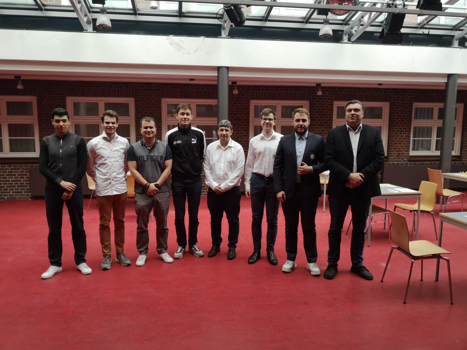 vielen Dank für das überwältigende Interesse an unserer 1.Bundesligamnnschaft und die zahlreichen Nachfragen bezüglich der Internet-Liveübertragung. Leider gibt es auch heute, zur 10. Runde am Sonntag, weiterhin technische Problem und nicht alle Partien werden korrekt übertragen. Wir entschuldigen uns bei unseren Fans und Sponsoren für die Enttäuschung. Die Verantwortung liegt jedoch bei unserem Reisepartner, dem Hamburger Schachklub und wir selbst können technisch nicht eingreifen. Hier zunächste ein Mannschaftfoto mit sieben Spielern und Thomas Böhm, der an diesem Wochenende freundlicherweise die sportliche Leitung übernommen hat. Mehr Infos folgen.